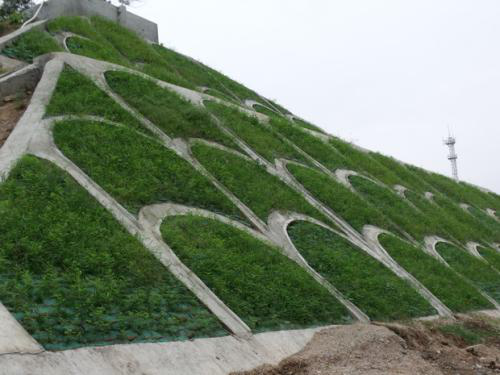 邊坡的植被覆蓋率達(dá)到30%以上時(shí),能承受小雨的沖刷,覆蓋率達(dá)80%以上時(shí)能承受暴雨的沖刷。待植物生長茂盛時(shí),能抵抗沖刷的徑流流速達(dá)6m/s,為一般草皮的2倍多。土工網(wǎng)的存在,對減少邊坡土壤的水分蒸發(fā),增加入滲量有良好的作用。同時(shí),由于土工網(wǎng)材料為黑色的聚乙烯,具有吸熱保溫的作用,可促進(jìn)種子發(fā)芽,有利于植物生長。四是快速防護(hù)措施⑴當(dāng)工期與植被培植期發(fā)生矛盾,在工程剛竣工即進(jìn)入暴雨季節(jié)時(shí),需采取“加筋草皮”對工程進(jìn)行快速防護(hù),以便竣工后即可得到全面覆蓋的防沖刷植被。“加筋草皮”采用三維植被網(wǎng)在草坪種植場或工地附近的空地上預(yù)先培植好草皮,成坪后即可整卷或分塊卷起,然后鋪設(shè)至需防護(hù)的邊坡上。⑵在難以治理的干旱地區(qū),可使用土壤凝結(jié)劑,把選擇好的適合的草籽,經(jīng)過特殊處理后,與土壤凝結(jié)劑拌和噴灑(也可以先播草籽,而后再施用土壤凝結(jié)劑)。經(jīng)土壤凝結(jié)劑處理后的坡面,草籽和土壤不會(huì)因風(fēng)吹雨淋而流失,同時(shí)凝結(jié)劑又降低了土壤中水分的蒸發(fā),在一定程度上保證了草籽的水分供應(yīng),大大提高草籽的成活率。