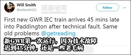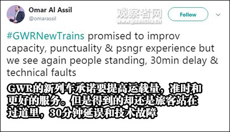 這讓旅客抱怨道:GWR的新列車承諾要提高運載量,準時和更好的服務(wù)。但是得到的卻還是旅客站在過道里,30分鐘延誤和技術(shù)故障。