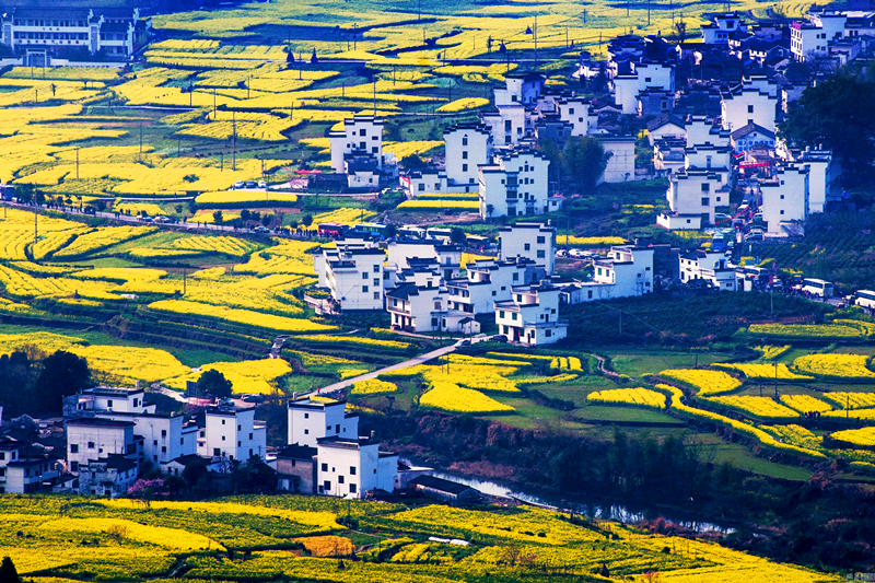 該縣要求全縣每一幢房子、每一座橋梁、每一條道路、每一片綠化,甚至每一扇門窗、每一處欄桿都按景觀物的要求來建設或制作,全面地融入地域的特色,形成“處處風光步步景”鄉(xiāng)村旅游發(fā)展格局。同時,注重風格的統(tǒng)一協(xié)調(diào),景區(qū)內(nèi)的景點建筑、村民建筑、單位建設都緊扣旅游主題,彰顯地方特色,新建房屋基本上采用新徽派風格,縣內(nèi)主要公路沿線、景區(qū)景點可視范圍,油菜種植覆蓋率達90%以上,形成了“油菜花經(jīng)濟”,三條精品旅游線路沿線茶園每年套種梨樹、桃樹等帶花苗木15萬余株,形成“花開百村景象”,使婺源鄉(xiāng)村旅游有看頭、看不完。