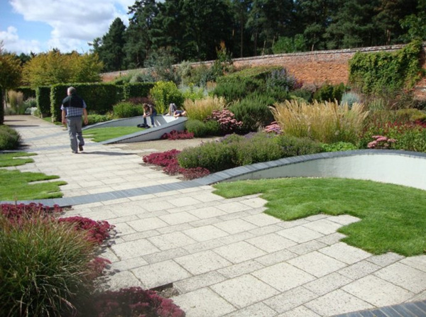 (2)鋪裝材料及鋪砌方式要統(tǒng)一,不宜變化太多。道路鋪裝要整齊、簡(jiǎn)潔。一條園路用同一種形式的鋪裝較好,同一條園路上不宜進(jìn)行太多的鋪裝變化,要服從整體的空間需要。一個(gè)空間中所用的鋪裝材料及拼砌圖案也不要過多,材料的過多變化或者過于繁瑣復(fù)雜的拼砌圖案容易造成雜亂無章的感覺。