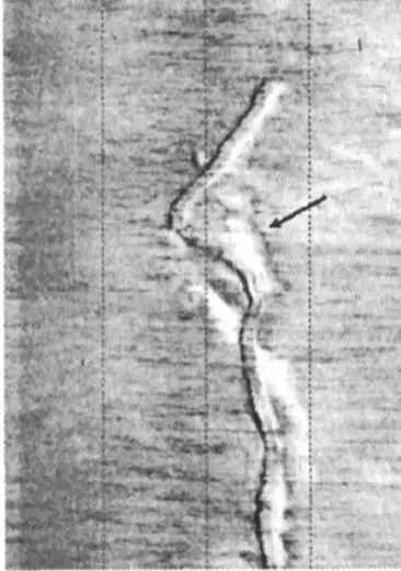 本實(shí)例為上海京海工程技術(shù)公司上級(jí)單位中國(guó)地質(zhì)科學(xué)院物化探研究所采用側(cè)掃聲納探測(cè)得到的資料。圖5是一段裸露于海底面上的電纜的側(cè)掃聲納圖像。該電纜為多年前采用水力噴射埋設(shè)方式鋪設(shè),但是由于鋪設(shè)時(shí)未能準(zhǔn)確的將該電纜放入噴射出的溝槽內(nèi),從而導(dǎo)致該電纜露在海底面上。