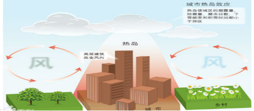 城市人口集中,工業(yè)發(fā)達(dá),交通擁塞,大氣污染嚴(yán)重,城市建筑大多為石材和混凝土,其熱容量低,熱傳導(dǎo)率高,加上建筑物本身對風(fēng)的阻擋或減弱作用,致城市年平均氣溫比郊區(qū)偏高(可高2℃以上),在溫度的空間分布上, 城市猶如一個溫暖的島嶼。