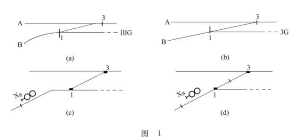 如圖1所示,(a)和(b)是1:2 000的線路平面圖。在圖1(a)中,l號道岔直向開通Ⅲ股道,所以Ⅲ股道是正線;信號平面布置圖的正確畫法如圖1(c)所示,既表達了B方向是支線的意思,又能明顯看出進Ⅲ股道是經(jīng)1號道岔的直向,進站信號機XB可以顯示一個黃燈或綠燈。在圖1(b)中,1號道岔直向開通3號道岔之側(cè)向,其信號平面布置圖的正確畫法如圖1(d)所示,盡管1號道岔定位開向3股道,但能明顯看出1號道岔直向是連接3號道岔之側(cè)向,所以進站信號機XB應封閉綠燈,也沒有一個黃燈的顯示。