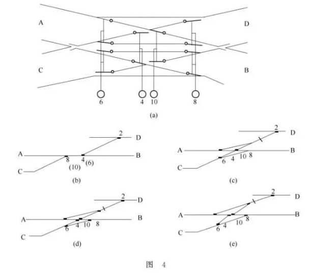 復式交分道岔之結(jié)構(gòu),如圖4(a)所示,4根尖軌用一臺轉(zhuǎn)轍機拉動,2根活動心軌 用一臺轉(zhuǎn)轍機拉動,一組交分道岔共用4臺轉(zhuǎn)轍機,暫用4、6、8、10編號。一組交分道 岔無論從其實際效用上還是電路設計上,都與圖4(b)中兩組單開道岔相當,只是為了 節(jié)省占地面積和縮短咽喉才采用復式交分道岔。