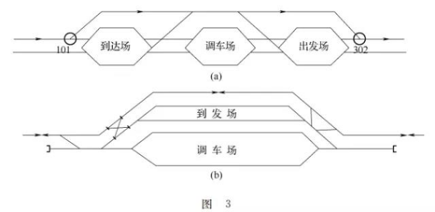示意圖如圖3所示,圖3(a)中的通過外包線并非正線,《技規(guī)》第27條對正線的定 義是明確的,正線是指連接車站并貫穿或直股伸入車站的線路。盡管圖3(a)中101和302號道岔可能都采用18號轍叉的道岔,但接入通過外包線的列車仍然按進側(cè)線處 理,進站信號機顯示兩個黃燈,外包線上的進路信號機無綠燈顯示。