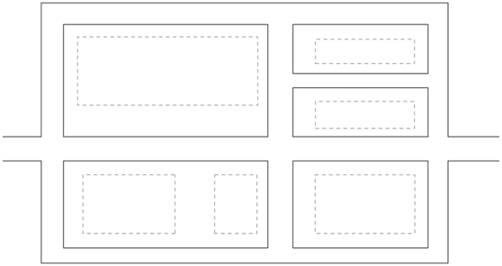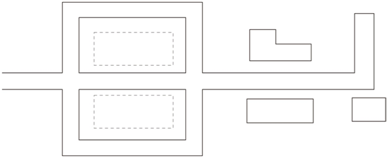 道路主要平行于主要建筑、構(gòu)筑物,圍繞各庫房進(jìn)行布置,這種道路布置形式受地形條件限制,一般不宜在山區(qū)丘陵地區(qū)采用,且道路的總長度及占地較多,對于交通繁忙、車流和人流組織需要分離的采用,如圖所示。