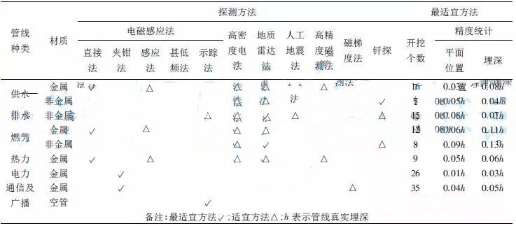 1) 各種管線類(lèi)型最適宜探測(cè)方法的精度均能達(dá)到規(guī)范。