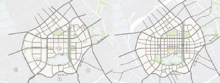且不說標題的錯誤,街道和道路本來就是兩個意思,而其實他想表達的意思是道路。切割城市的道路也要看區(qū)域,看尺度,一味否定絕對不是正確的觀點。而這樣的思考,多少年前,城市設計的實踐領(lǐng)域也早已出現(xiàn)。何況道路和人其實不是對立的(下圖來自[SOM][2008]武漢王家墩商務核心區(qū)設計規(guī)劃方案,比較城市設計前后的路網(wǎng)密度)