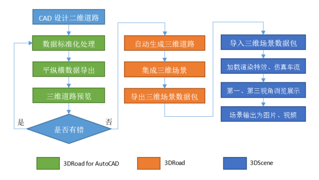 三維道路設(shè)計(jì)方案可視化流程,如下圖所示: