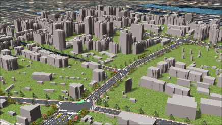 然后,通過3DRoad自動(dòng)生成三維道路,批量加載道路附屬設(shè)施,自動(dòng)拉伸三維建筑或者加載三維建筑的BIM、3dmax等模型,集成三維場(chǎng)景;