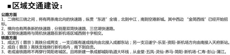依托成巴高速、成南高速、天府國際機(jī)場高速等“六射一環(huán)”高速公路輻射區(qū)域,帶動區(qū)域協(xié)同發(fā)展。建設(shè)金簡仁快速、中金簡快速、成資快速等多條區(qū)域快速通道,帶動沿線城鄉(xiāng)發(fā)展。