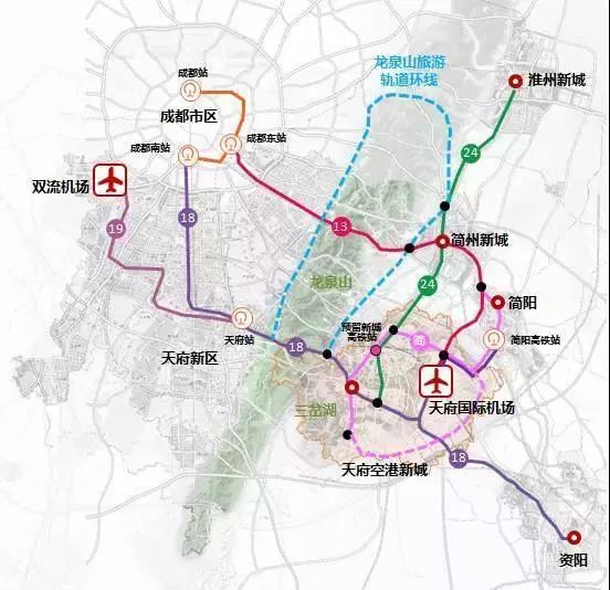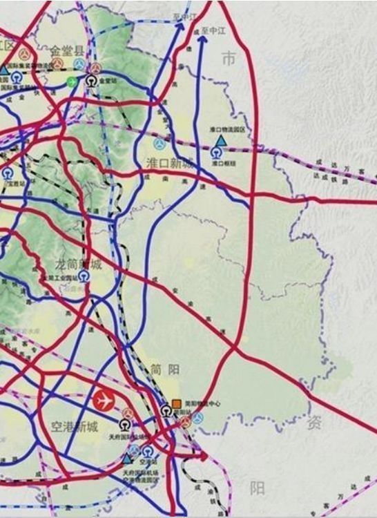 依托既有成渝鐵路、達(dá)成鐵路和規(guī)劃貨運(yùn)外繞線,連接青白江國際鐵路港,融入 “ 蓉歐+ ” 。淮州新城預(yù)留國際鐵路港功能。規(guī)劃建設(shè)蓉昆高鐵成自段、成達(dá)萬高鐵等7條出川高鐵,融入國家高鐵網(wǎng)絡(luò)。推動成渝客專、遂成鐵路和蓉昆高鐵成自段等鐵路公交化運(yùn)營,強(qiáng)化區(qū)域協(xié)作。依托18號線、13號線等軌道快線,實(shí)現(xiàn)中心城區(qū)和東部城市新區(qū) “ 半小時 ” 到達(dá)機(jī)場。