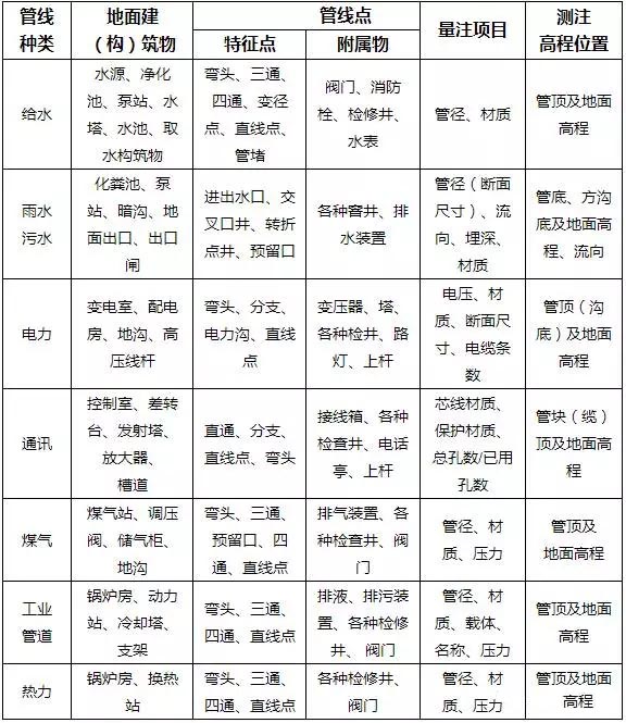 明顯管線點(diǎn)和新建管線點(diǎn)應(yīng)按下表所示內(nèi)容查明管線上的建(構(gòu))筑物和管線點(diǎn)。