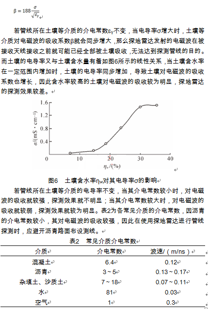探地雷達發(fā)射高頻電磁波進行探測時,土壤等介質(zhì)的對電磁波的吸收系數(shù)β與電導率σ成正比,即