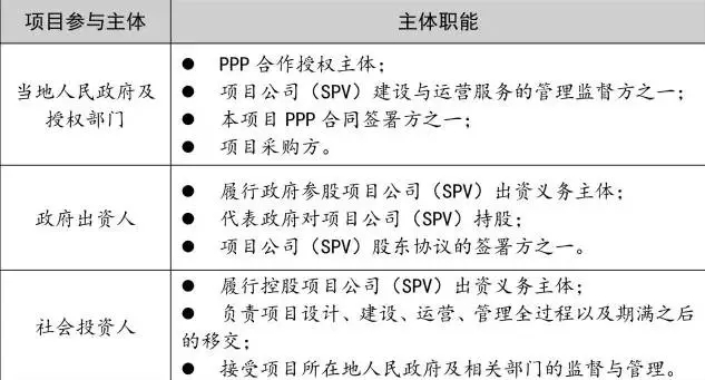農(nóng)村生活污水治理工程PPP項(xiàng)目參與主體主要包括項(xiàng)目所在地人民政府及授權(quán)部門(mén)、政府出資人及社會(huì)投資人。本項(xiàng)目參與主體的具體職能見(jiàn)下表所示: