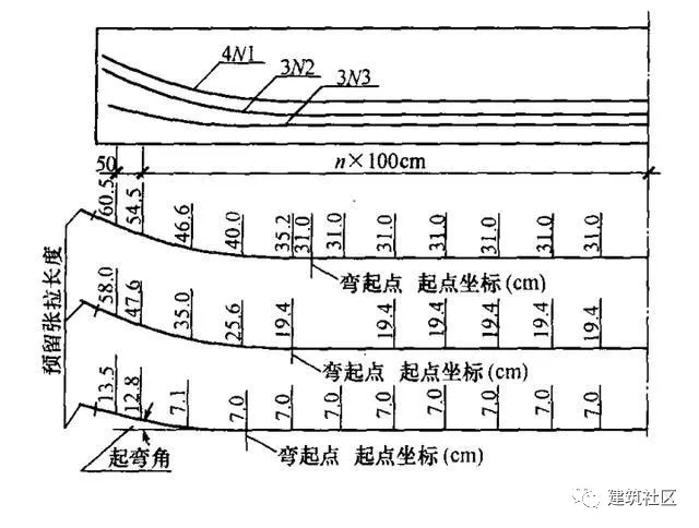(5)對彎起的預(yù)應(yīng)力鋼筋應(yīng)列表或直接在預(yù)應(yīng)力鋼筋大樣圖中,標(biāo)出彎起角度、彎曲半徑切點的坐標(biāo)(包括縱彎或既縱彎又平彎的鋼筋)及預(yù)留的張拉長度(圖2-47)。