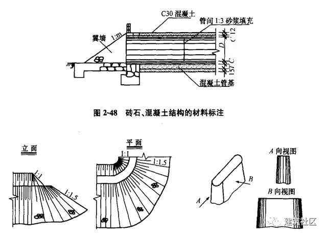 (1)磚石、混凝土結(jié)構(gòu)圖中的材料標(biāo)注,可在圖形中適當(dāng)位置,用圖例表示(圖2-48)。當(dāng)材料圖例不便繪制時,可采用引出線標(biāo)注材料名稱及配合比。