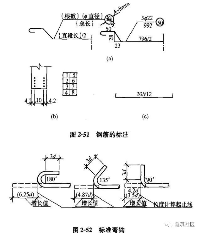 (5)鋼筋末端的標(biāo)準(zhǔn)彎鉤可分為90°, 135°, 180°三種(圖2-52)。當(dāng)采用標(biāo)準(zhǔn)彎鉤時(標(biāo)準(zhǔn)彎鉤即最小彎鉤),鋼筋直段長的標(biāo)注可直接注于鋼筋的側(cè)面(圖2-52)。