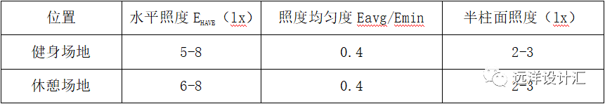 ?。?)健身場(chǎng)地照明要有足夠的水平照度和垂直照度,同時(shí)要有足夠的均勻度。休閑場(chǎng)地照明應(yīng)滿足交流、觀賞和安全需求。見(jiàn)表3-2。