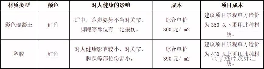 根據(jù)鋪裝材質(zhì)、顏色對(duì)人健康的影響,綜合項(xiàng)目成本控制,居住區(qū)慢跑步道鋪裝材質(zhì)選擇見(jiàn)下表3-1: