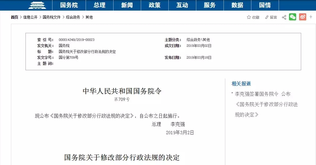 2019年3月18日,中國國務(wù)院總理李克強(qiáng)簽署國務(wù)院令,公布《國務(wù)院關(guān)于修改部分行政法規(guī)的決定》(以下簡(jiǎn)稱《決定》),自公布之日起施行。