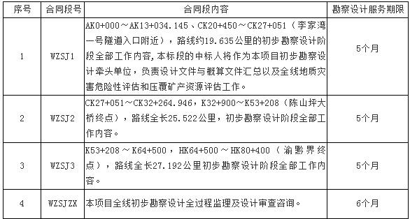 萬(wàn)盛至正安高速公路重慶段啟動(dòng)初步勘察設(shè)計(jì),2019年6月4日發(fā)布了初步勘察設(shè)計(jì)及技術(shù)咨詢服務(wù)招標(biāo)公告。據(jù)悉萬(wàn)盛至正安高速公路重慶段劃分4個(gè)合同標(biāo)段。估算總投資162.7億元,建安費(fèi)約118.4億元。