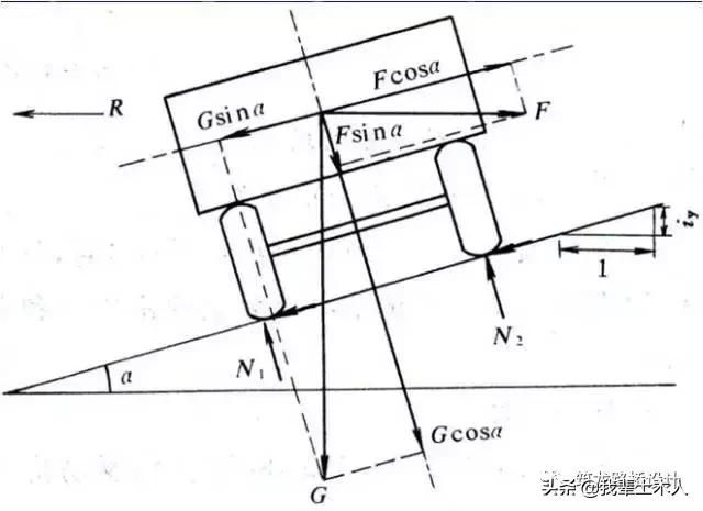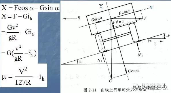 由于路面橫向傾角α一般很小,則sinα≈tgα=ih,cosα≈1,其中ih稱為橫向超高坡度,