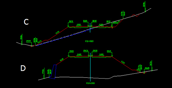 C截面值得注意的是左邊原地面線比較陡,怕邊坡日后滑動(dòng),失穩(wěn)等,把原地面線挖成臺(tái)階再填土做路基。右邊避免山上的雨水直接流入道路,設(shè)置了截水溝,又叫天溝。