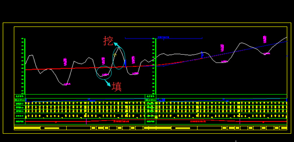 白線是路線中線的高程起伏情況,那么我們一定是想填土和挖土都少一點(diǎn)吧?于是我們考慮縱斷面的填挖平衡且盡量就近平衡??磮D中填挖基本平衡,就近也基本平衡。這里紅線就是我們定下的路線高度位置。圖下面是各種高度數(shù)據(jù),填挖土高度數(shù)據(jù)。平面和縱面要協(xié)調(diào)設(shè)計(jì),有時(shí)候發(fā)現(xiàn)縱斷面圖形太奇葩,那么平面設(shè)計(jì)要調(diào)整。平縱組合也有原則。后面的橫斷面設(shè)計(jì)也是會(huì)發(fā)現(xiàn)前面工作要改的。