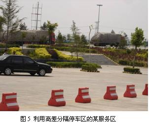 規(guī)劃應(yīng)考慮按照不同車輛的停車要求將停車場進(jìn)行合理劃分,較合理的劃分應(yīng)該是:客車區(qū)、小轎車區(qū)、貨車及超長車區(qū)及特種車區(qū)。根據(jù)這四類不同車輛的不同要求,規(guī)劃停車區(qū)和牽出道,嚴(yán)禁客貨混停,防止超長車倒車停放。各區(qū)之間用綠島隔離,達(dá)到美化遮陽的效果;或者利用地形高差自然分隔,也可以防止不同類型車輛混停,這在我們調(diào)研中就有很好的一例(如圖5所示)。停車場可盡量做大,隔離島要少而小,避免影響停車和交通,要盡可能留有發(fā)展余地,所需土地可一次征用,分期擴(kuò)建,初期可暫以綠地替代。
