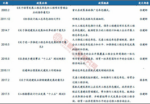 ——自2003年開始,國家陸續(xù)出臺政策推廣總承包模式,并引導(dǎo)裝配式建筑原則上使用總承包模式。2016年住建部發(fā)布《關(guān)于進(jìn)一步推進(jìn)工程總承包發(fā)展的若干意見》,《意見》強調(diào)大力推進(jìn)工程總承包,提升項目可行性研究和初步設(shè)計深度,實現(xiàn)設(shè)計、采購、施工等各階段工作的深度融合,提高工程建設(shè)水平。