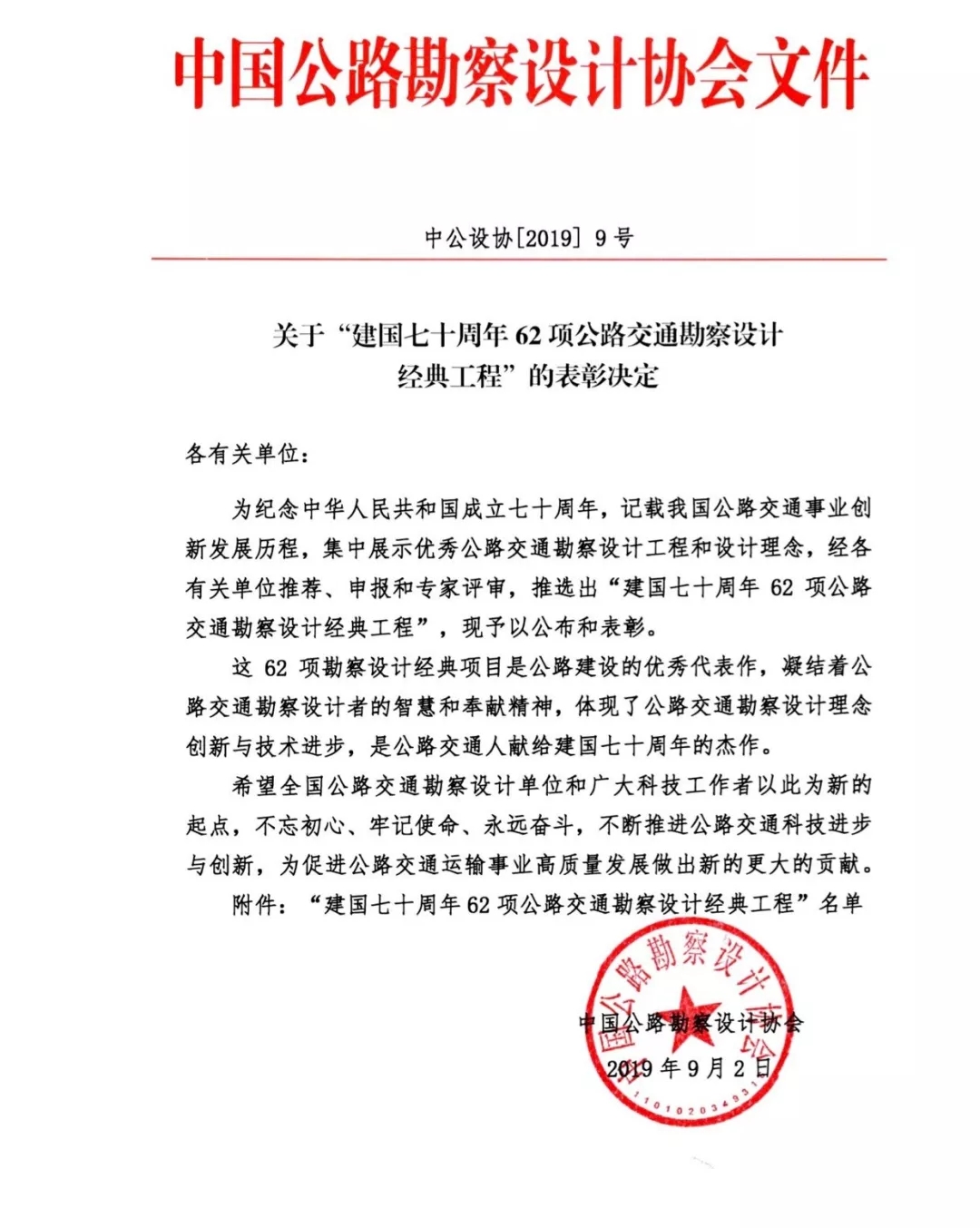 中國公路勘察設(shè)計協(xié)會表彰62項“建國七十周年公路交通勘察設(shè)計經(jīng)典工程”