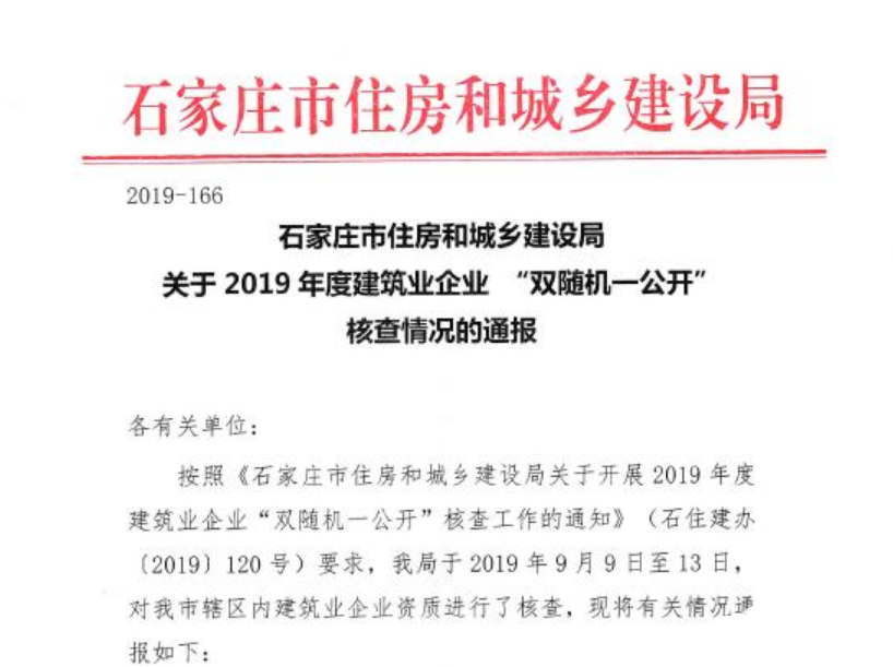 月26日石家莊住房和城鄉(xiāng)建設(shè)局發(fā)布《關(guān)于2019年度建筑業(yè)企業(yè) “雙隨機(jī)一公開(kāi)” 核查情況的通報(bào)》,2019年9月9日至13日石家莊住房和城鄉(xiāng)建設(shè)局對(duì)轄區(qū)內(nèi)建筑業(yè)企業(yè)資質(zhì)進(jìn)行了核查,本次共核查238家建筑業(yè)企業(yè),其中僅41家達(dá)到資質(zhì)標(biāo)準(zhǔn)要求,共有135家企業(yè)不合格。