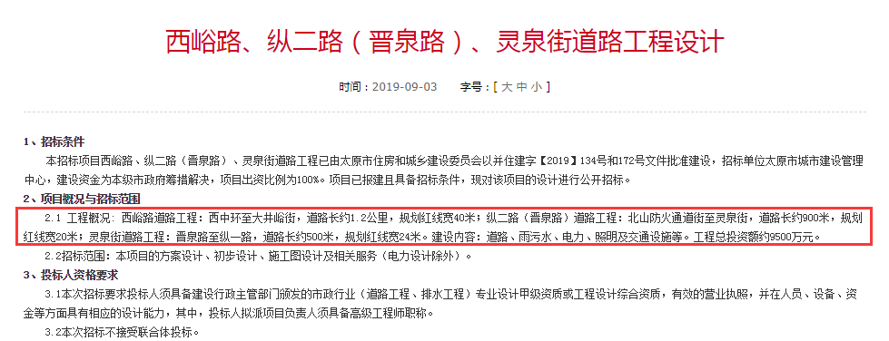 根據(jù)招標顯示,本招標項目西峪路、縱二路(晉泉路)、靈泉街道路工程已由太原市住房和城鄉(xiāng)建設(shè)委員會以并住建字【2019】134號和172號文件批準建設(shè),招標單位太原市城市建設(shè)管理中心,建設(shè)資金為本級市政府籌措解決,項目出資比例為100%。