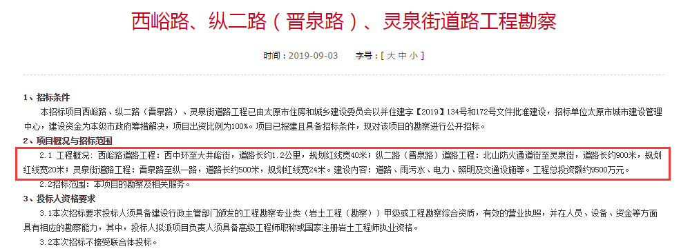 工程概況:西峪路道路工程:西中環(huán)至大井峪街,道路長約1.2公里,規(guī)劃紅線寬40米;縱二路(晉泉路)道路工程:北山防火通道街至靈泉街,道路長約900米,規(guī)劃紅線寬20米;靈泉街道路工程:晉泉路至縱一路,道路長約500米,規(guī)劃紅線寬24米。建設(shè)內(nèi)容:道路、雨污水、電力、照明及交通設(shè)施等。工程總投資額約9500萬元。