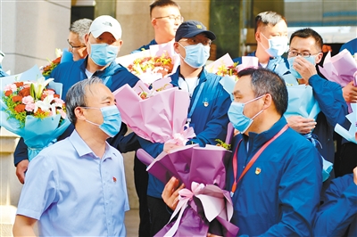 下午4點左右,29名珠峰高程測繪隊員們在大家翹首期盼下回到省測繪地理信息局。彼時,留守在“家”的戰(zhàn)友和家人們早已經(jīng)在這里等候他們。短暫的歡迎儀式后,家人和朋友們擁抱和握手成為他們表達(dá)思念的方式。這29名測繪隊員不少人已經(jīng)在珠峰待了兩三個月,有的甚至?xí)r間更長,回到西安讓他們感到格外親切。“我從過年前就去拉薩集訓(xùn)了,有大半年時間都沒有見到孩子了。太想念家人,想念西安的肉夾饃、泡饃啦!”皮膚黝黑的測繪隊員邢雄旺說。