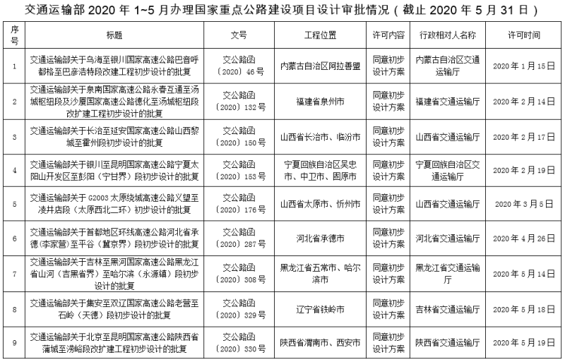 交通運(yùn)輸部2020年1~5月辦理國家重點(diǎn)公路建設(shè)項目設(shè)計審批情況(截止2020年5月31日)