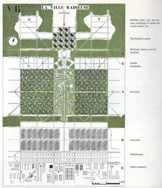 他的方案,也被稱為“公園中的塔”,名副其實(shí):無數(shù)的高層建筑,每一個(gè)都被綠色空間包圍。每一棟建筑都被規(guī)劃師戲稱為“超級(jí)街區(qū)”,空間被清晰地劃分為不同的用途(在上圖中包括“住宅”、“商業(yè)中心”、“工廠”和“倉(cāng)庫(kù)”)。