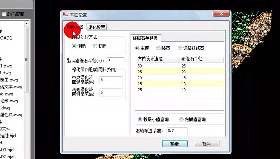 4)三種方式都可以按最小值查詢和內(nèi)插值來查詢。默認(rèn)的路緣石半徑“5m”,中央、兩側(cè)綠化帶回退距離“5m”。