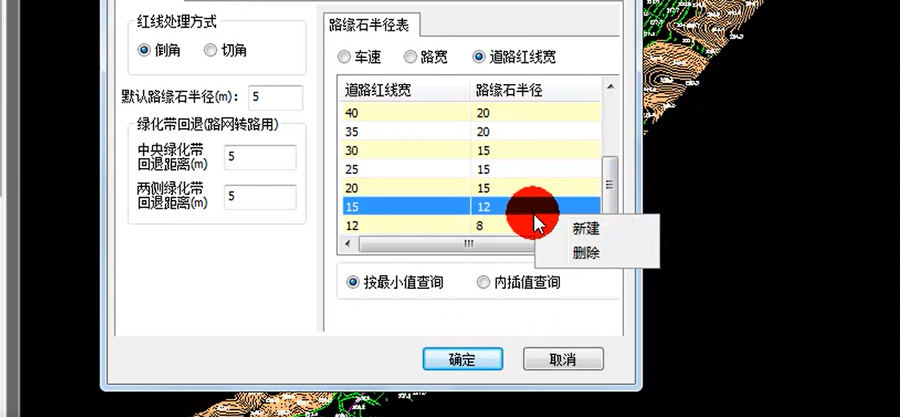 3)道路紅線寬是指針對不同的道路紅線寬對于不同的路緣石半徑,我們可以進(jìn)行“新建”、“刪除”。