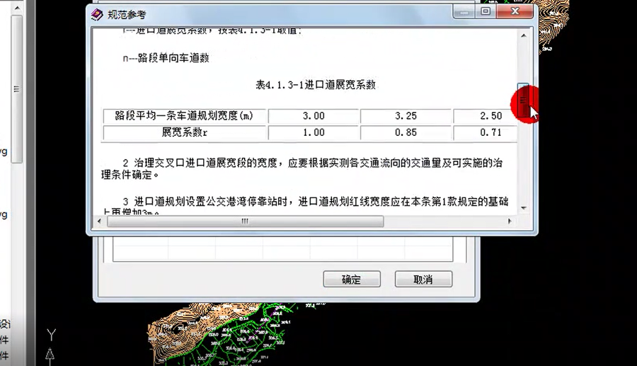 1)再看渠化設(shè)置,渠化長度量取點(diǎn)選擇“路緣石弧線端點(diǎn)”,進(jìn)口渠化寬度“3m”,出口渠化寬度“3.25m”,查看規(guī)范數(shù)據(jù)。