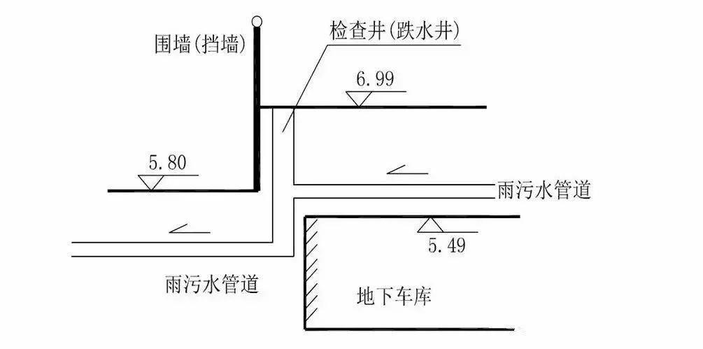 針對項目地下管線需跨越地庫、小區(qū)環(huán)路、市政道路3個標高,小區(qū)雨污水管無法直接排入市政管網,設計上選用跌水井,如圖。