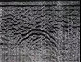 (4)管線深度和水平位置的確定:管線的深度可從雷達(dá)剖面圖上直接讀取,探地雷達(dá)系統(tǒng)自動(dòng)把時(shí)間域轉(zhuǎn)換成空間域。電磁波在不同介質(zhì)中的傳播速度是不一樣的,在確定管線深度之前,最好在測(cè)量區(qū)域內(nèi)找一條已知管線進(jìn)行傳播速度測(cè)試。管線的水平位置可由測(cè)量輪精確測(cè)得,而且探地雷達(dá)具有現(xiàn)場(chǎng)回拉定位功能,當(dāng)屏幕上顯示出管線波形時(shí)(天線拖動(dòng)方向與管線方向垂直時(shí),典型波形反應(yīng)為拋物線),可將天線回拉,屏幕上將出現(xiàn)一個(gè)光標(biāo),隨著天線的回拉,光標(biāo)在雷達(dá)剖面圖上移動(dòng),當(dāng)光標(biāo)移動(dòng),當(dāng)光標(biāo)移到拋物線頂點(diǎn)時(shí),天線的中心位置對(duì)應(yīng)的就是該管線軸心的平面位置。