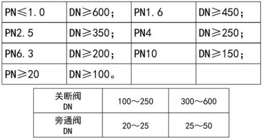 壓力≥1.6MPa,且直徑≥500mm的閘閥應(yīng)安裝旁通閥。直徑按閥門直徑十分之一選用。
