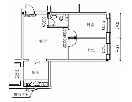 在室內鋪設燃氣管線時,必須注意:①不能鋪設在潮濕或含有腐蝕性介質的房間,也不能將其引入臥室,特別是在臥室、浴室或衛(wèi)生間里;②嚴禁通過易燃、爆炸物品、配電間、變電所、煙、風道等場所;③橫穿臥房、衛(wèi)生間或地下室的管道,應在套管內安裝焊接;④如需放置于潮濕或有腐蝕性介質的室內,則應采用防腐蝕措施;⑤管道穿越樓板、樓梯平臺、墻壁、隔墻時,應將管線置于套管內。⑥安裝燃氣灶的房間凈高不宜低于2.2米,安裝熱水器的房間應該宜大于2.4米。如圖3所示,室內廚房豎管的設計。