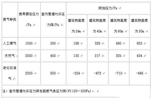 燃?xì)夥N類 燃具額定壓力/Pa 室內(nèi)管道允許壓力降/Pa 附加壓力/Pa 建筑物高度為24m 建筑物高度為40m 建筑物高度為60m 建筑物高度為80m 人工煤氣 1000 300 196 326 490 653 天然氣 2000 400 130 217 325 434 液化石油氣 2800 500 -284 -473 -710 -946 注:室內(nèi)管道允許壓力降包括燃?xì)獗韷毫?約120~200Pa)。