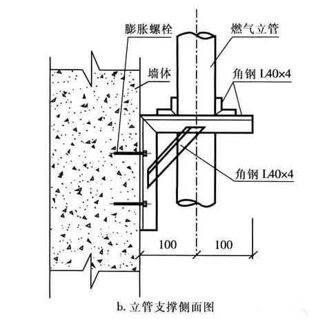 隨著建筑物層數(shù)的增加,燃?xì)饬⒐艿拈L度也變長,管道的自重變大,所以應(yīng)設(shè)置管道的固定支架,使固定支架與建筑物成為一體,防止因管道下沉而引起引入管受力折斷或變形引起倒坡。一般固定管道的做法有: