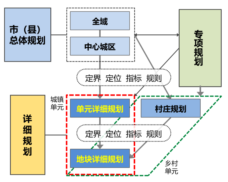 ?。ㄒ唬┲貥?gòu)“中心城區(qū)—單元—地塊”傳導(dǎo)層級。針對原控規(guī)承接傳導(dǎo)體系不健全情況,依據(jù)國土空間總體規(guī)劃,立足城鎮(zhèn)開發(fā)邊界和中心城區(qū)關(guān)系,重構(gòu)“全域空間—中心城區(qū)—單元—地塊”多層級、全覆蓋的傳導(dǎo)體系。明確單元作為市、縣國土空間總體規(guī)劃向詳細規(guī)劃傳導(dǎo)規(guī)劃內(nèi)容和要求的空間載體,是詳細規(guī)劃編制、管理、實施和監(jiān)督的基本單位,在國土空間總體規(guī)劃階段劃定。地塊則是詳細規(guī)劃管理和項目實施單位。