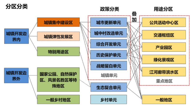 ?。ㄒ唬┐罱ㄓ猛痉謪^(qū)疊加分類政策多場景。立足國土空間全域全要素規(guī)劃管控要求,協(xié)調(diào)城鎮(zhèn)開發(fā)邊界內(nèi)外關(guān)系,劃分一般用途區(qū)和重點用途區(qū),其中重點區(qū)包括公共活動中心區(qū)、交通樞紐區(qū)和江河廊帶濱水區(qū)等。在用途分區(qū)基礎(chǔ)上,疊加各類政策,明確城市更新、城中村改造、綜合開發(fā)、歷史保護、生態(tài)復(fù)合和戰(zhàn)略留白等類型單元,進行分區(qū)分類指引,實現(xiàn)土地利用全生命周期、全利用方式的管控,保障相關(guān)政策得以落地。