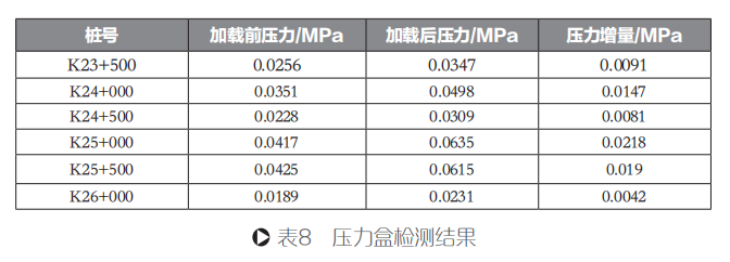為測(cè)量長(zhǎng)壽命瀝青路面試驗(yàn)路段土基頂面所受壓力,根據(jù)《公路路基路面現(xiàn)場(chǎng)測(cè)試規(guī)程》(JTG E60-2008)要求,在試驗(yàn)路行車道上埋置壓力盒,測(cè)取在10t軸載單輪下的壓力值,具體檢測(cè)結(jié)果如表8所示。